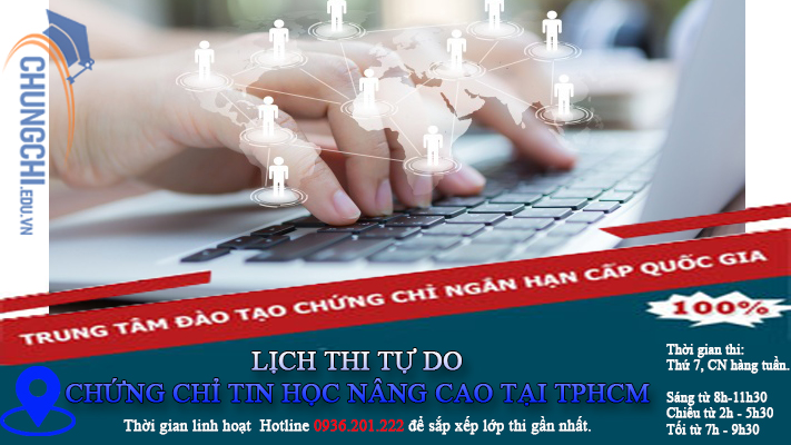 Thông báo lịch thi tự do chứng chỉ tin học nâng cao (chứng chỉ công nghệ thông tin nâng cao) tại Tphcm. Đăng ký thủ tục đơn giản và hiệu quả. Cấp chứng chỉ sau 3 tuần khi hoàn thành kỳ thi. Cấp giấy xác nhận đã thi đạt chứng chỉ tin học với học viên có nhu cầu cần gấp nộp nhà trường hoặc hoàn thiện hồ sơ. Đăng ký sắp xếp thi ngay vào thứ 7, chủ nhật hàng tuần. Liên hệ: 0936.201.222 ( thầy Dũng)